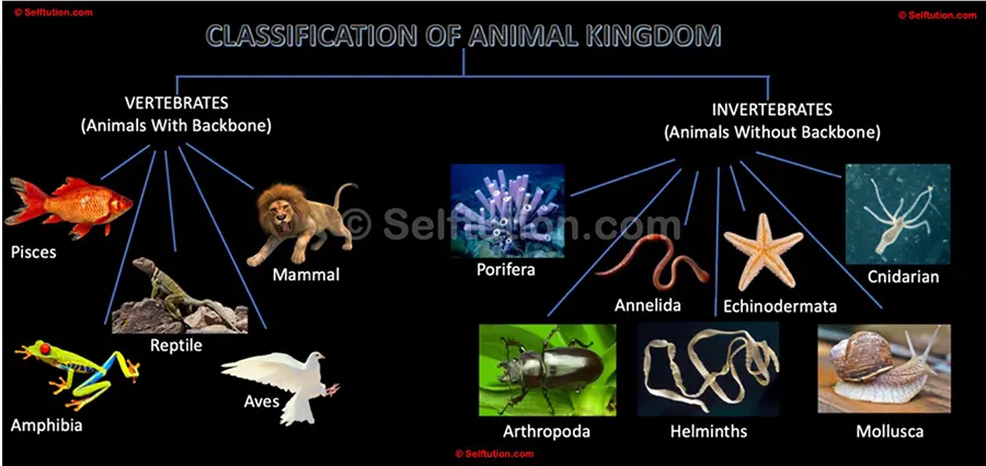 Classification of the animal kingdom into groups: invertebrates and vertebrates. Invertebrates are further classified into – Porifera, Cnidarians, Helminths, Annelids, Arthropoda, Mollusca, Echinodermata, and Vertebrates are further classified into – Pisces, Amphibia, Aves, Reptiles, and Mammals.